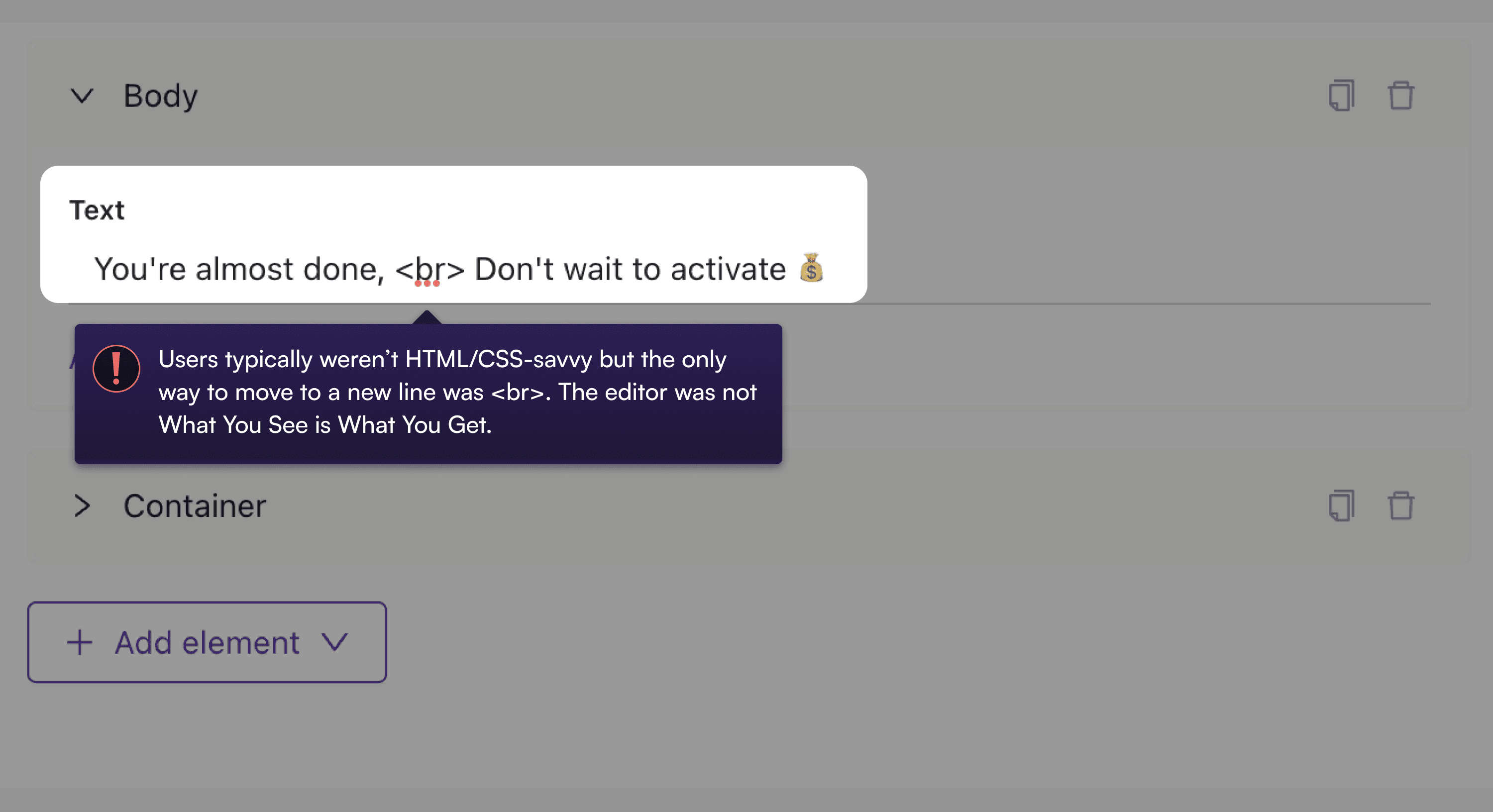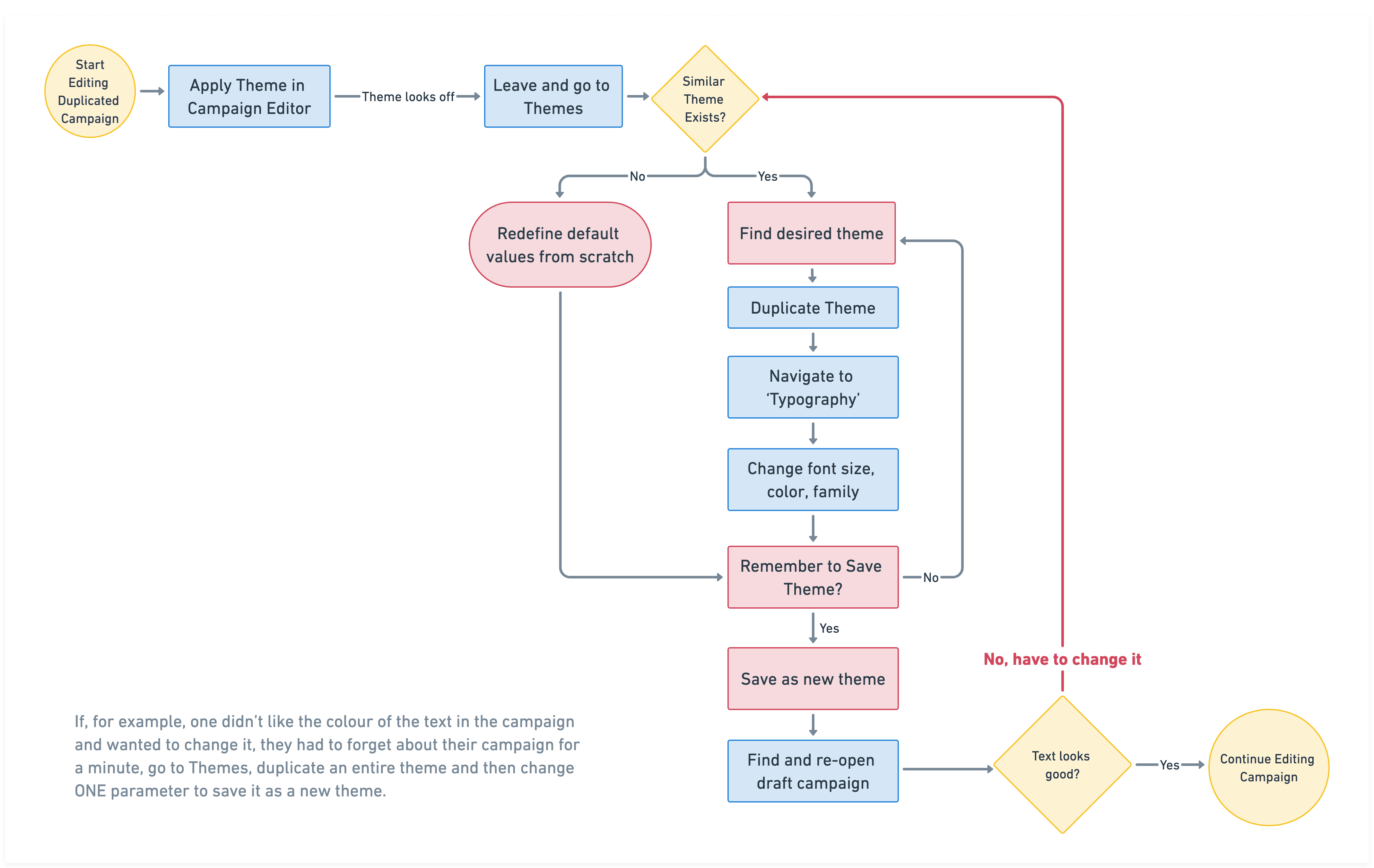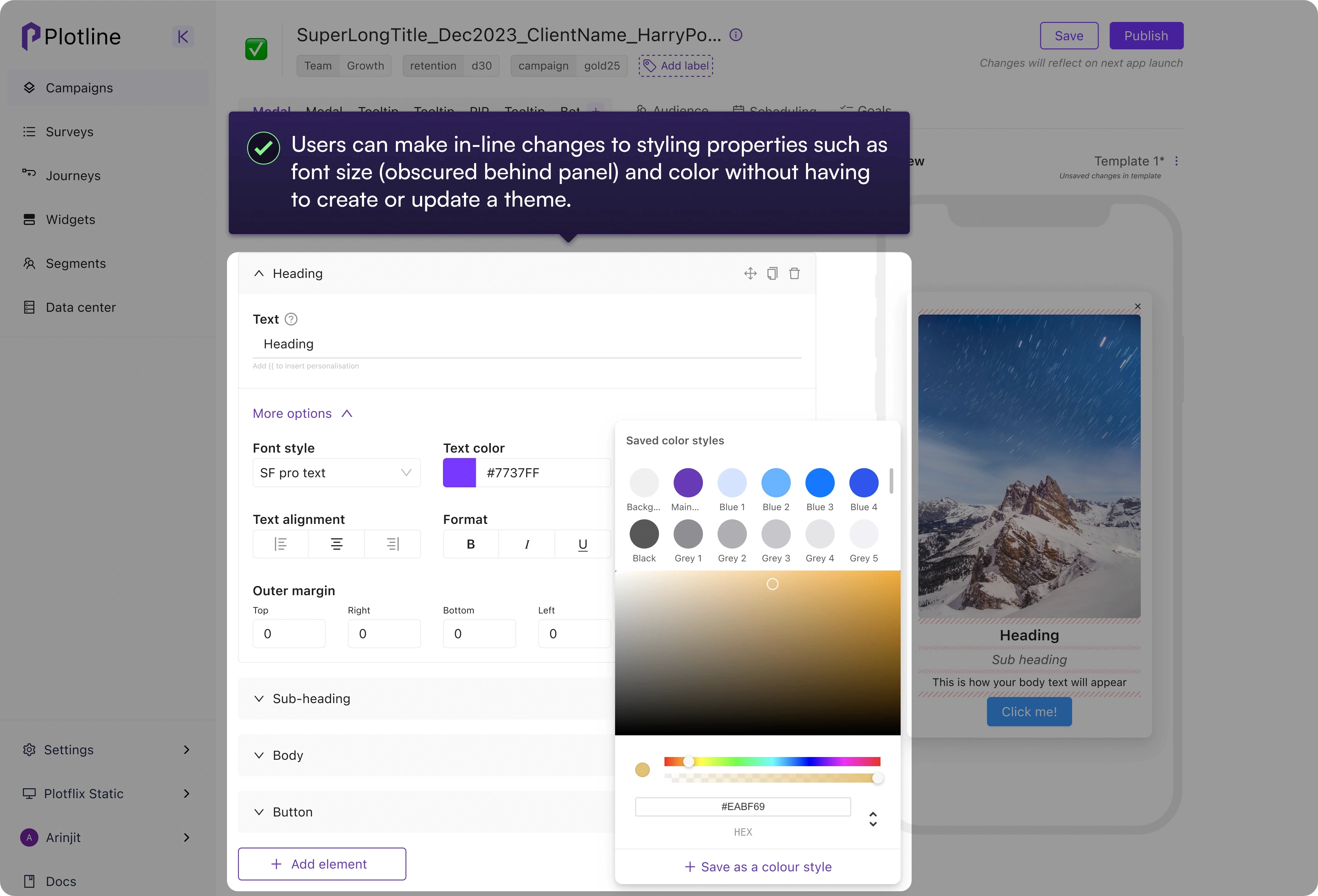 No in-line editing of themes: Users couldn’t change an element's styling property such as color while creating a campaign. They had to: