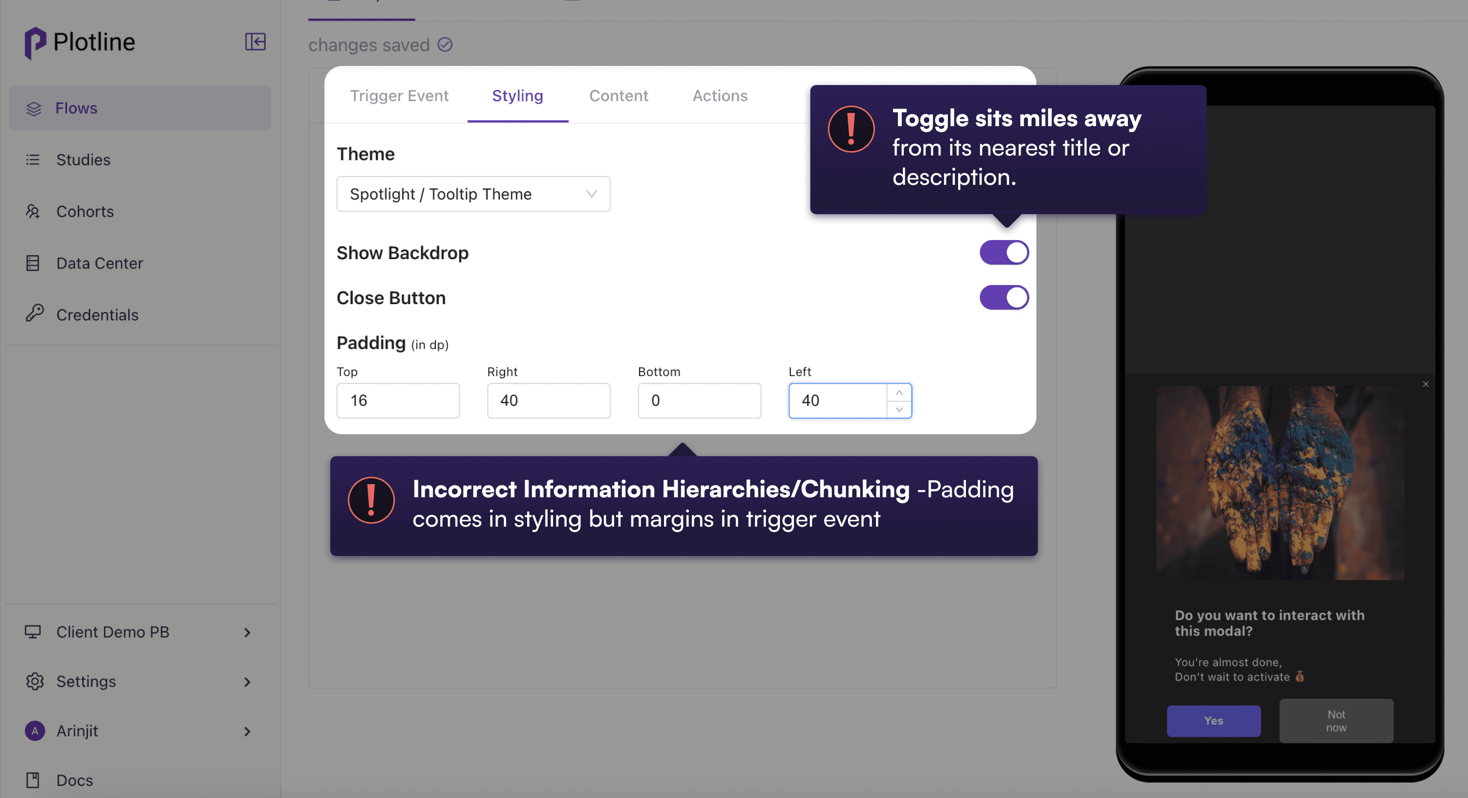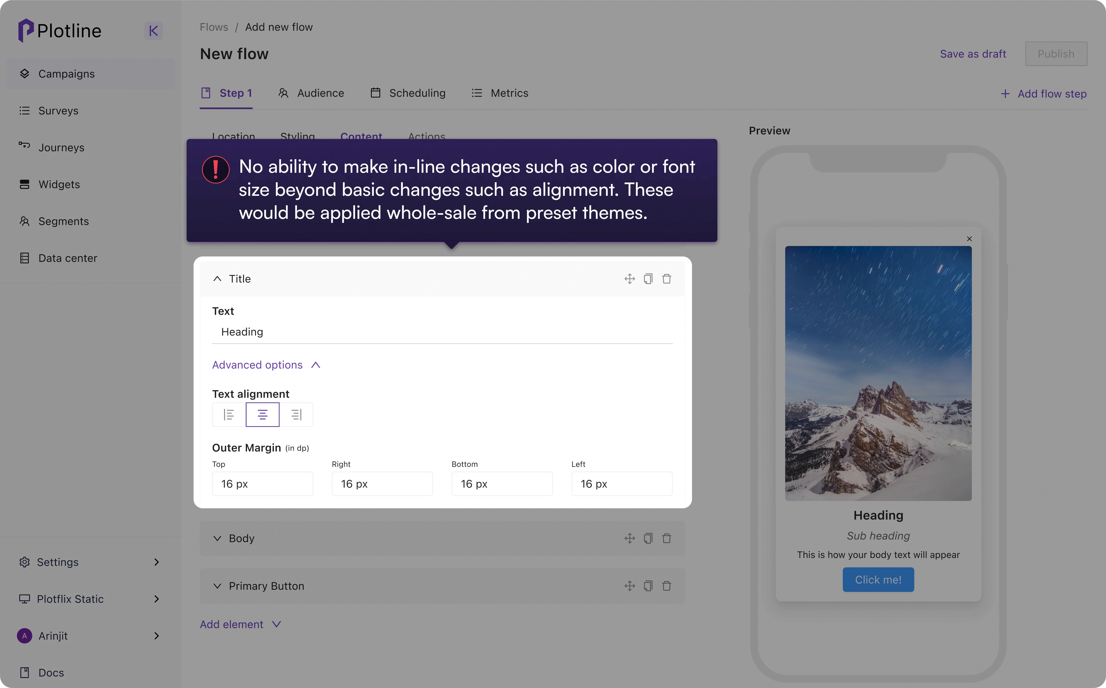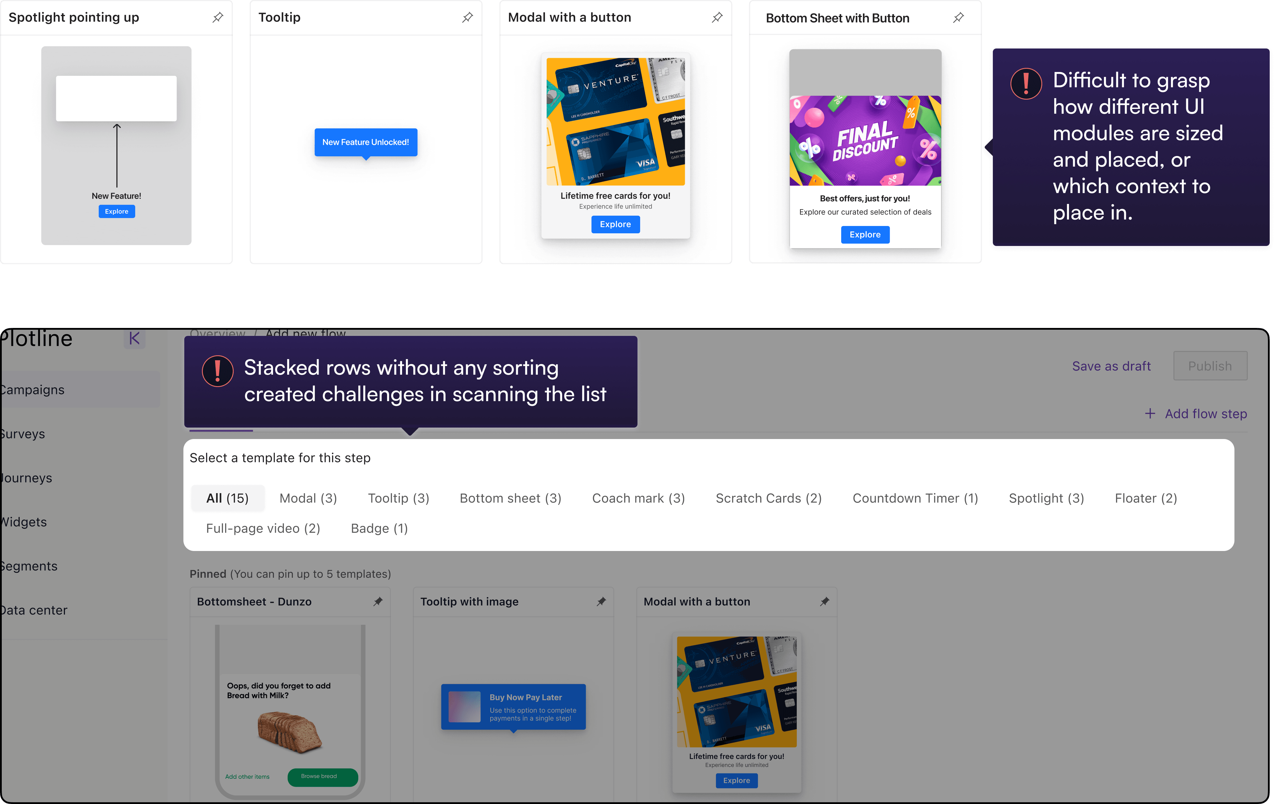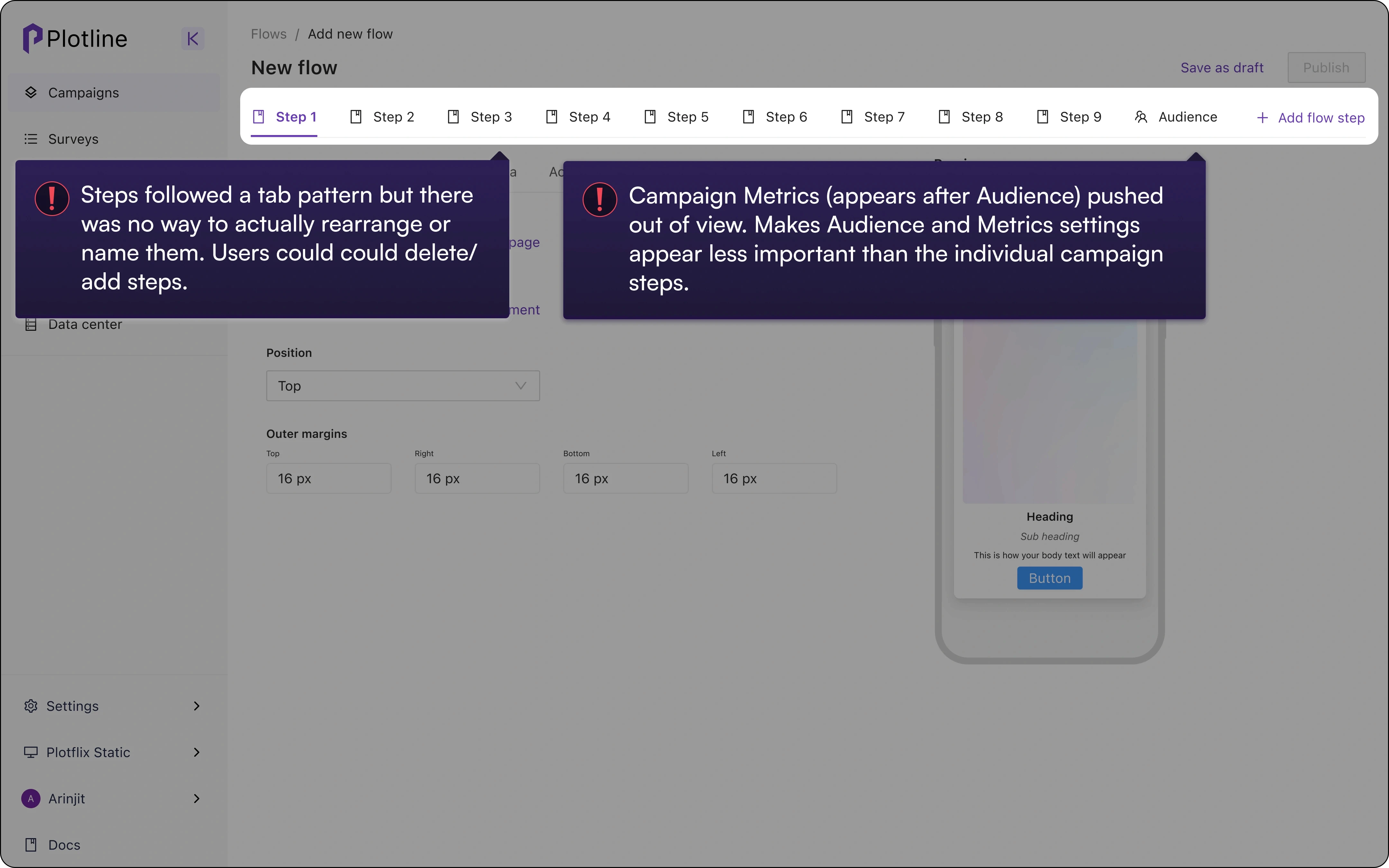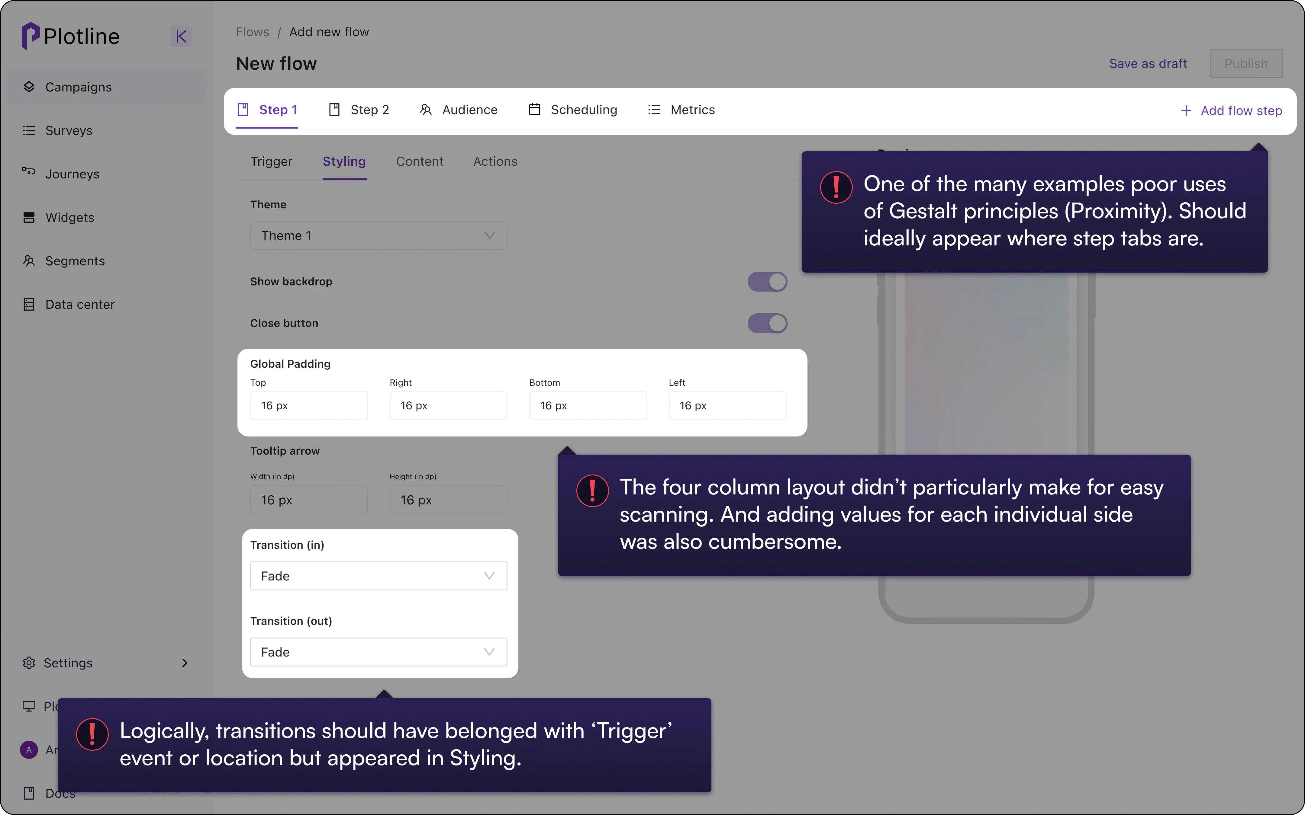 Plotline's core proposition was the ability to go live with in-app campaigns effortlessly but was unwittingly introducing unnecessary friction with multiple UX issues in the campaign creation journey,