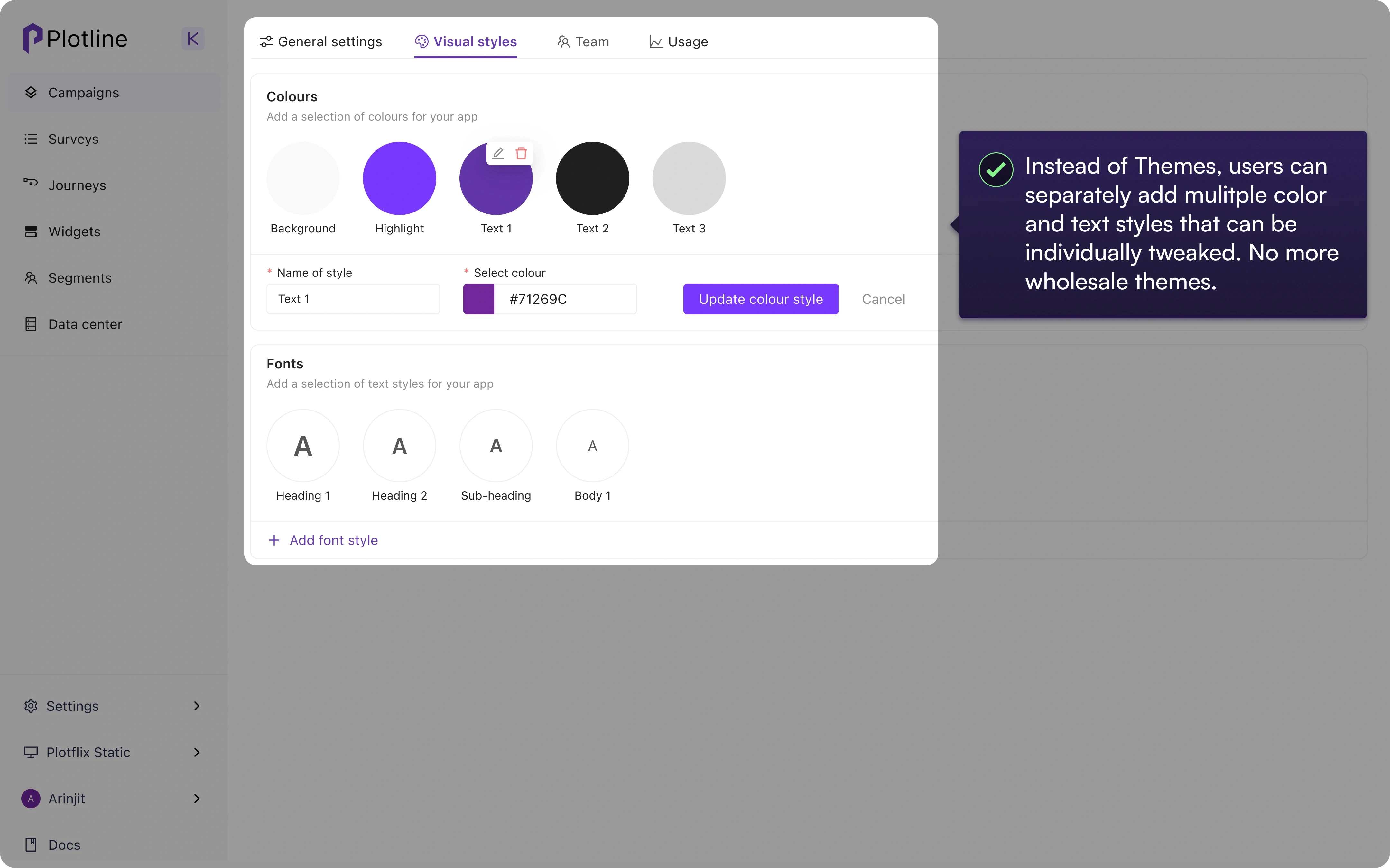 Demerged color and font styles that can be individually tweaked and applied