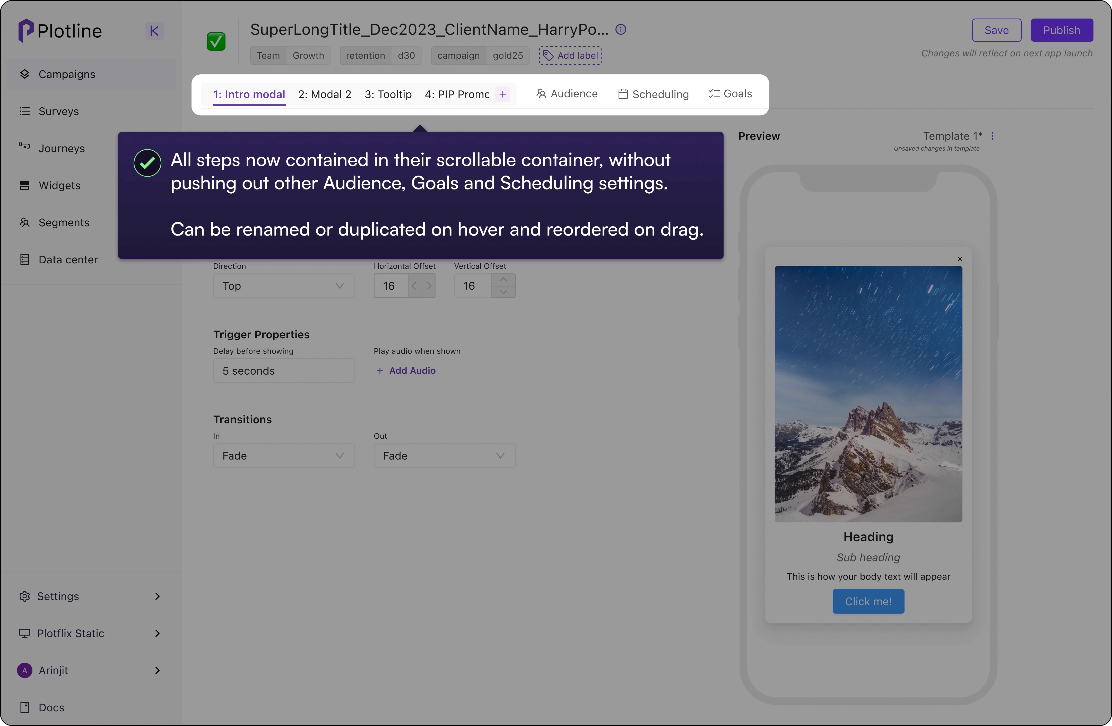 Plotline’s headline product Campaigns allows users to customize and publish in-app flows with multiple UI nudge types (tooltips, modals, spotlights, etc.) and any number of steps with custom filters for specific cohorts and time windows.