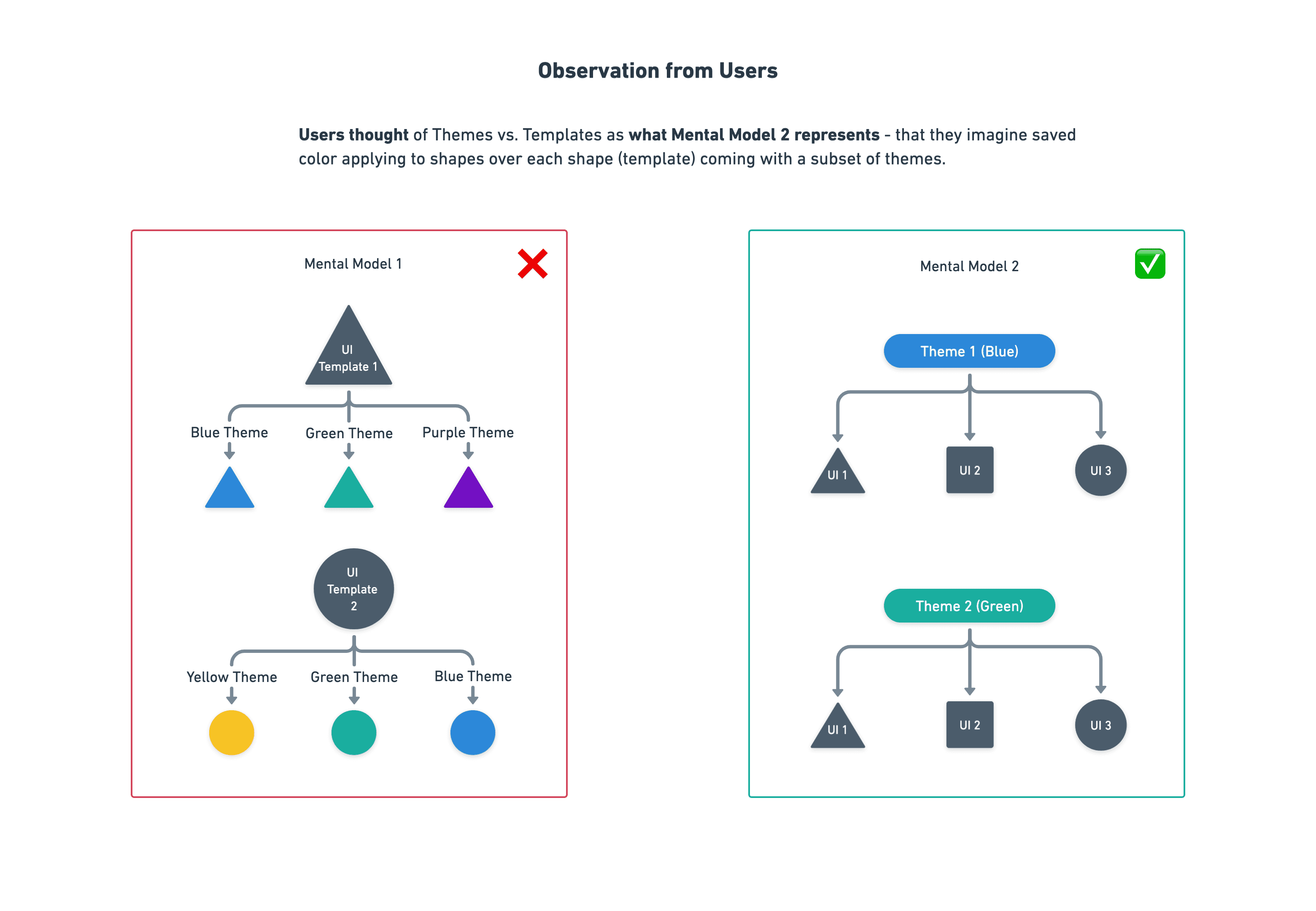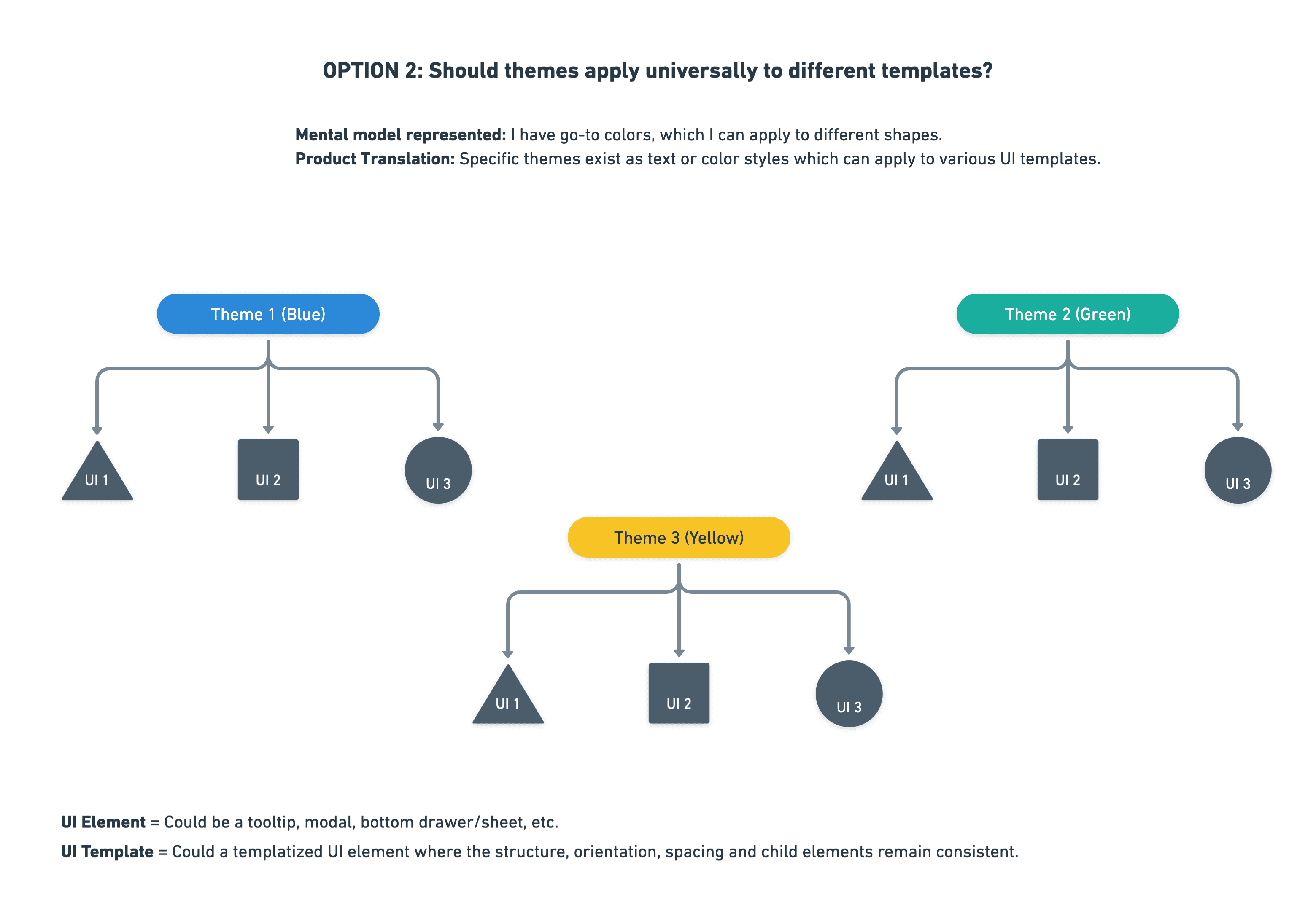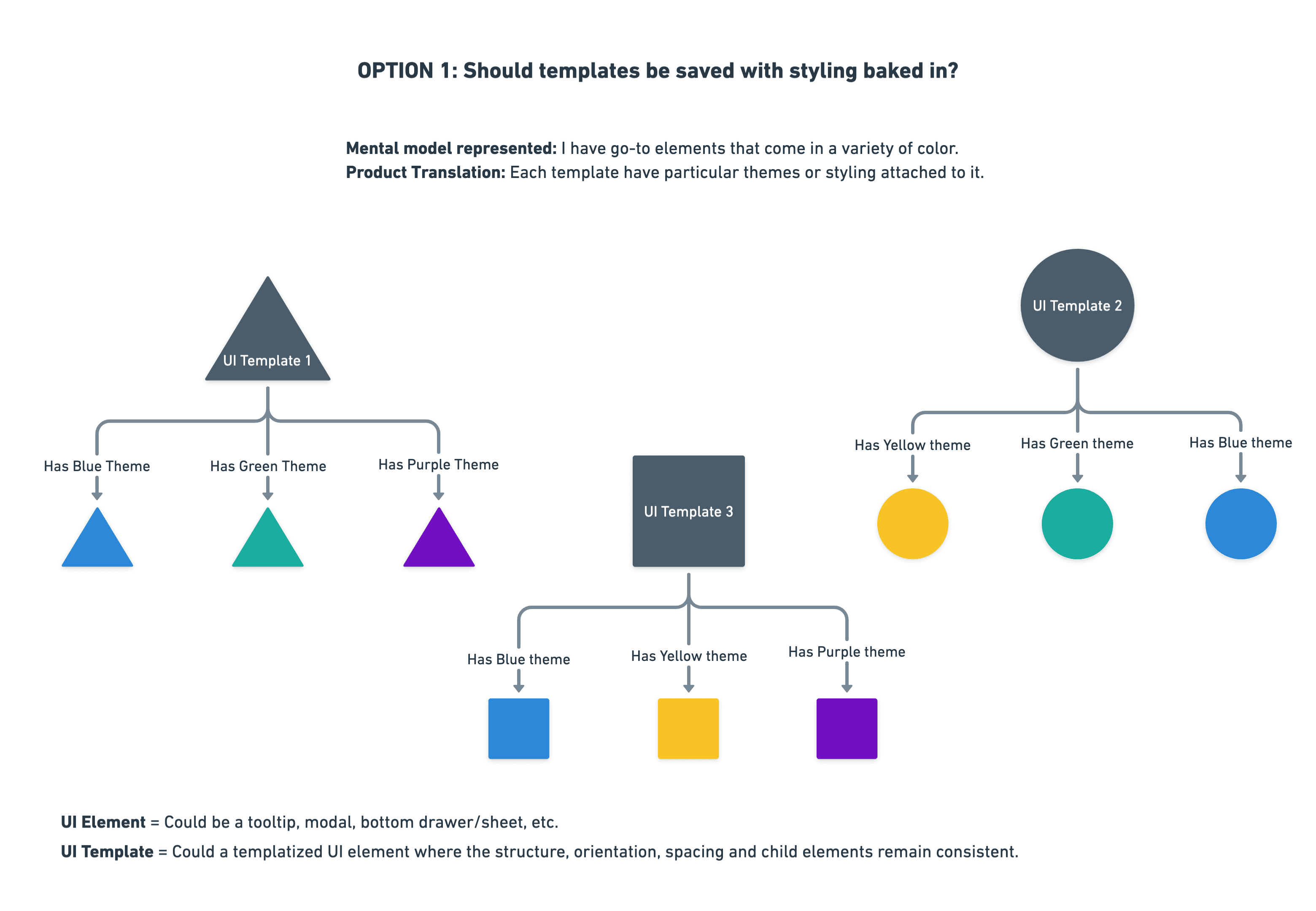 My co-designer believed themes should be a subset of templates for maximum efficiency. Users set up with go-to UI elements each with 3 or 4 themes.