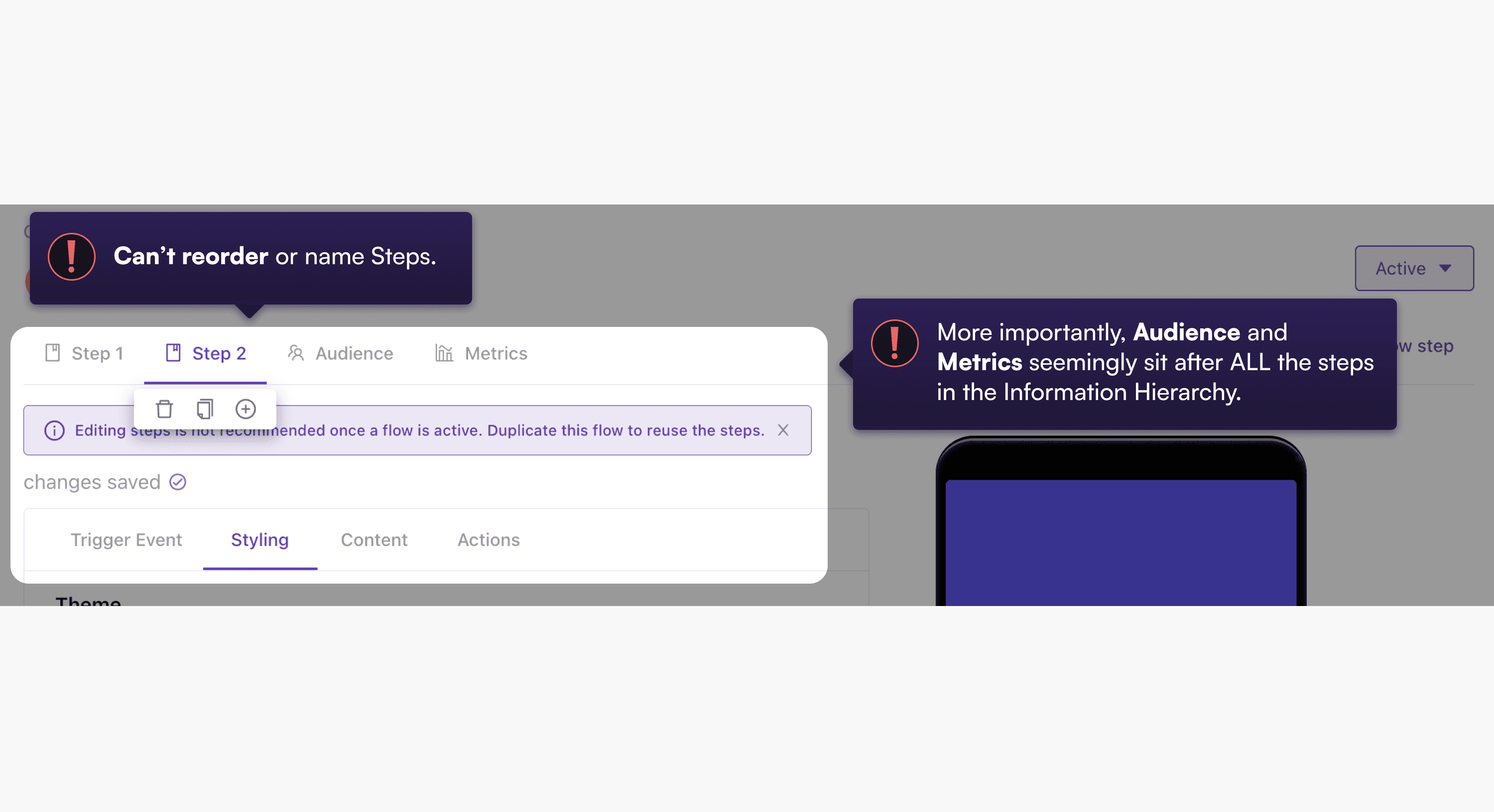 Inability to rename or reorder Campaign steps. Users would forget the contents of the steps and inadvertently make mistakes.