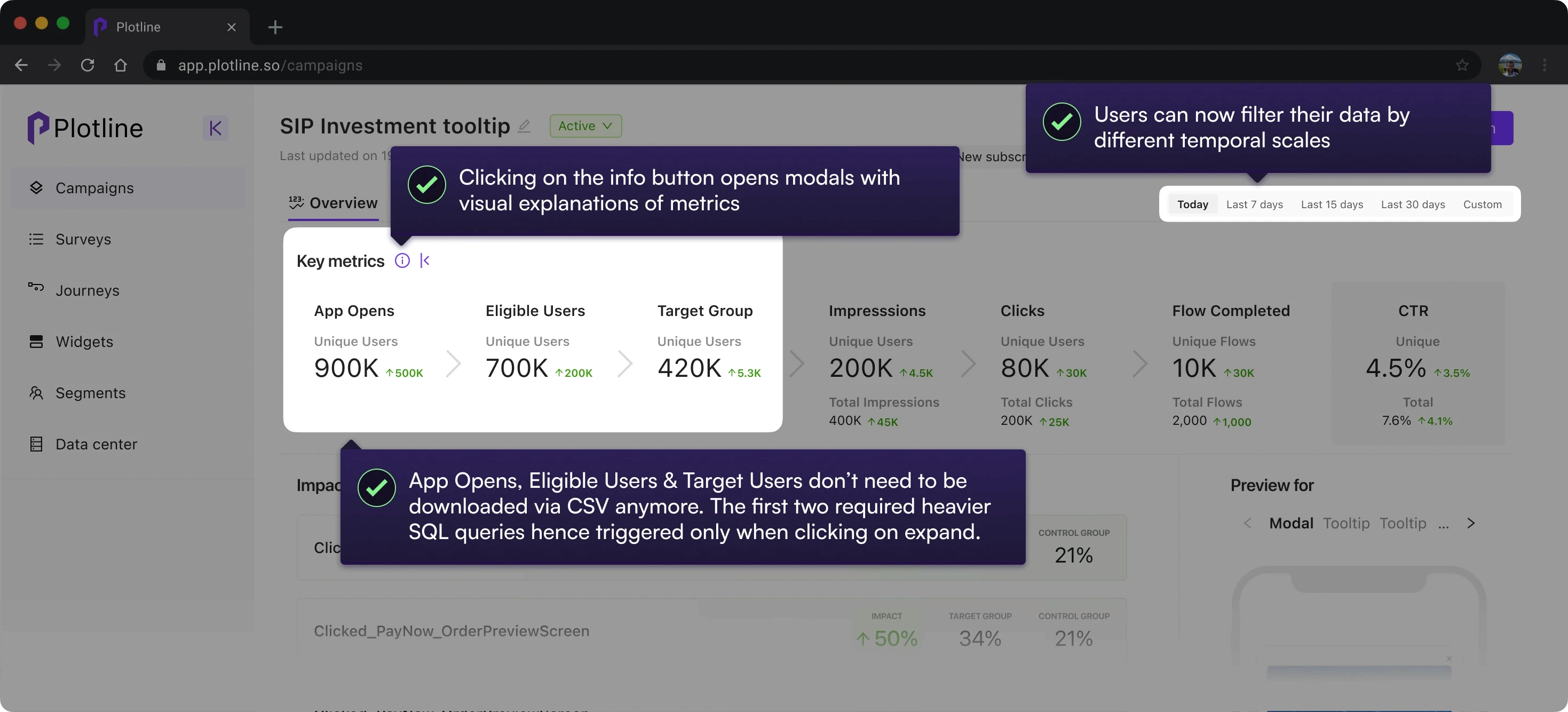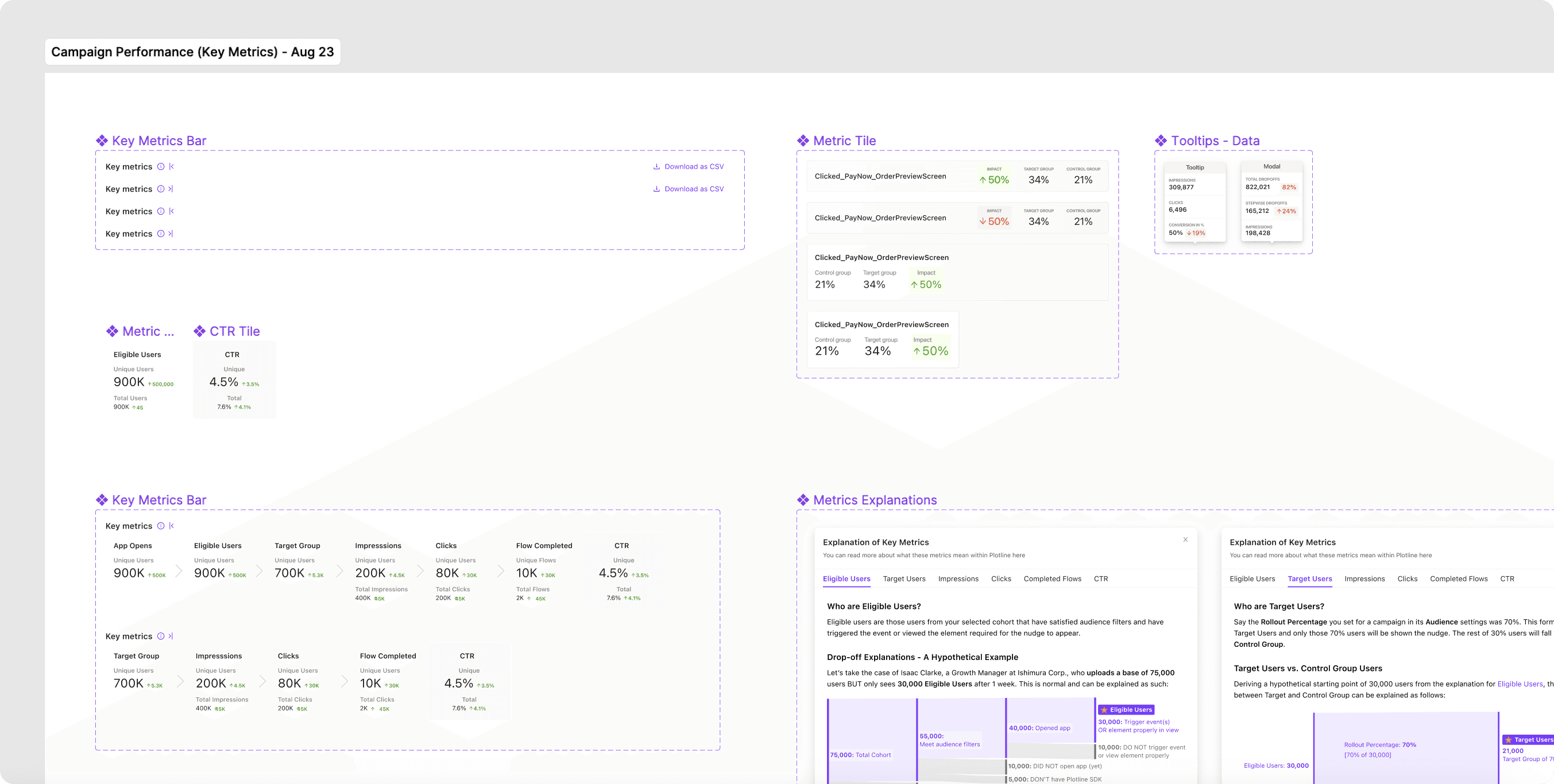 Existing implementation obscured the funnel relationship between App Opens, Eligible Users, Target Users, Clicks and CTRs. Also, some metrics were accessible only via CSVs.