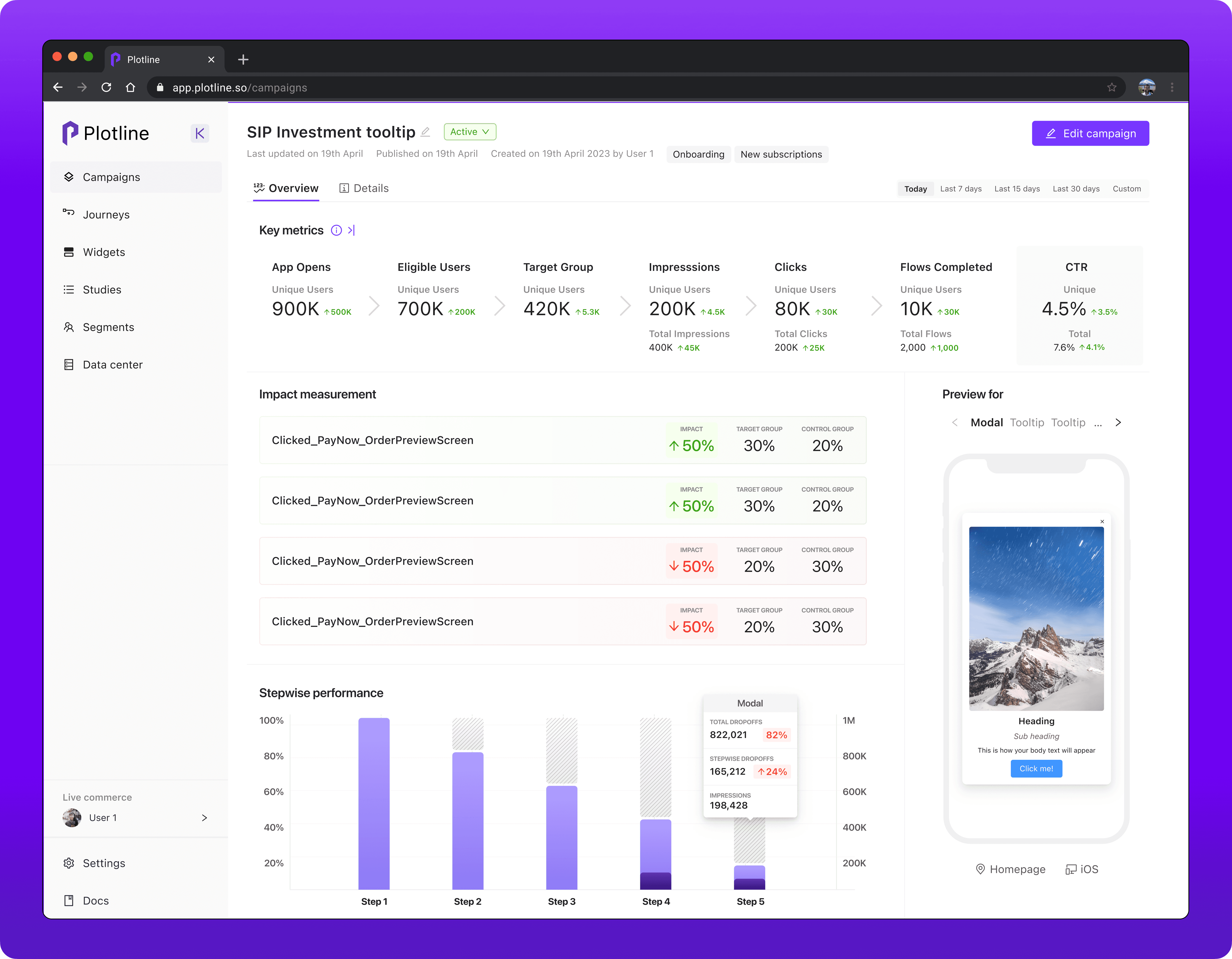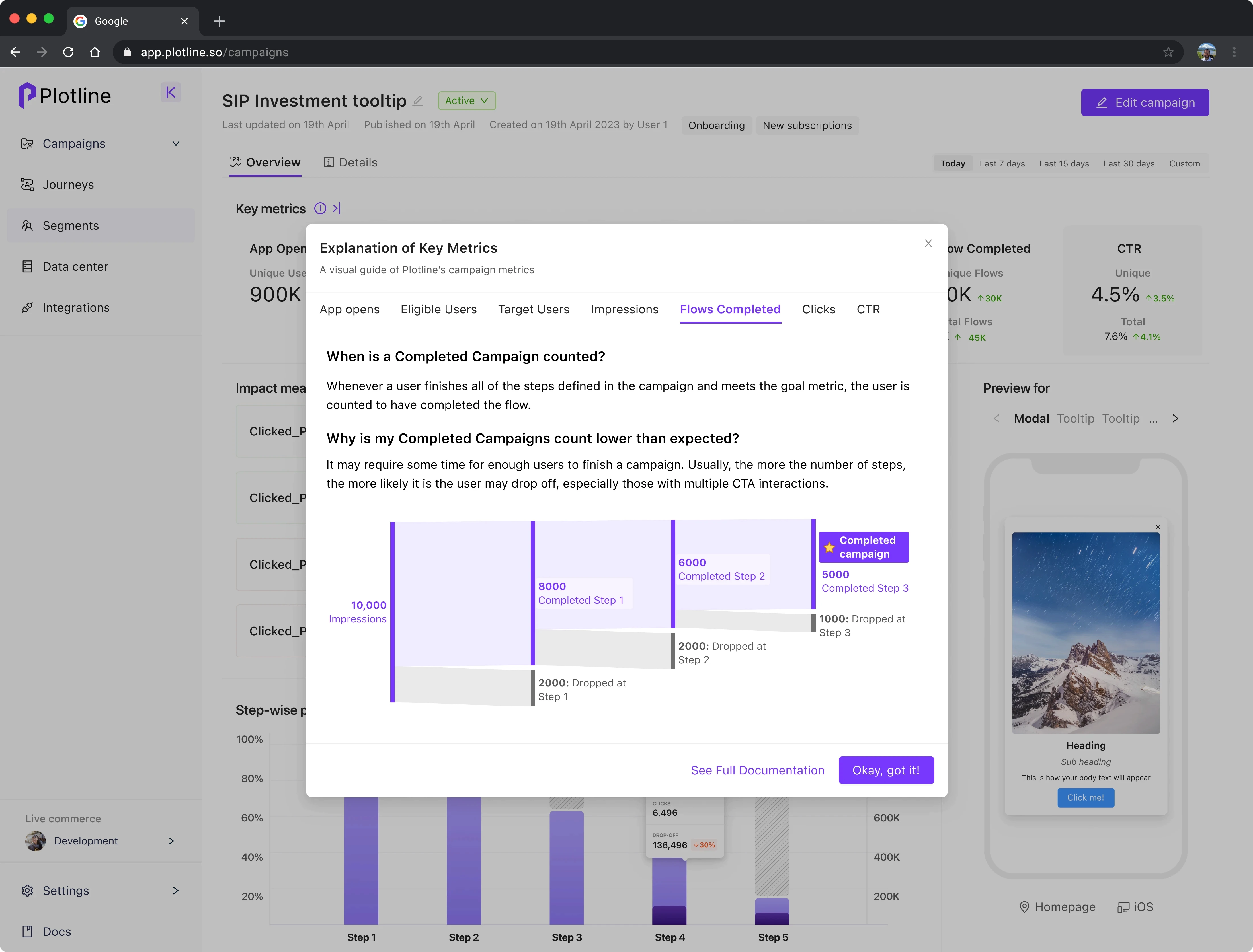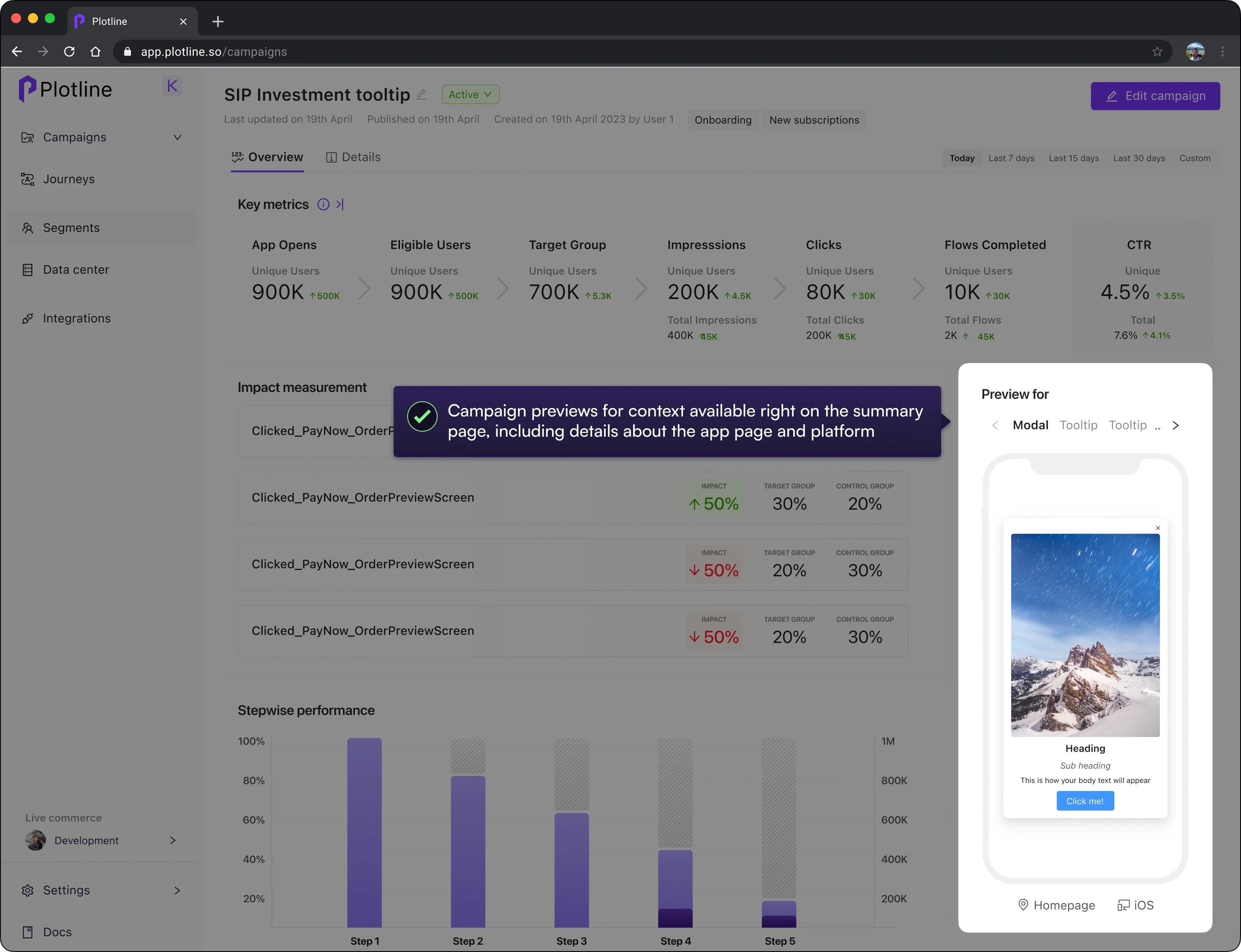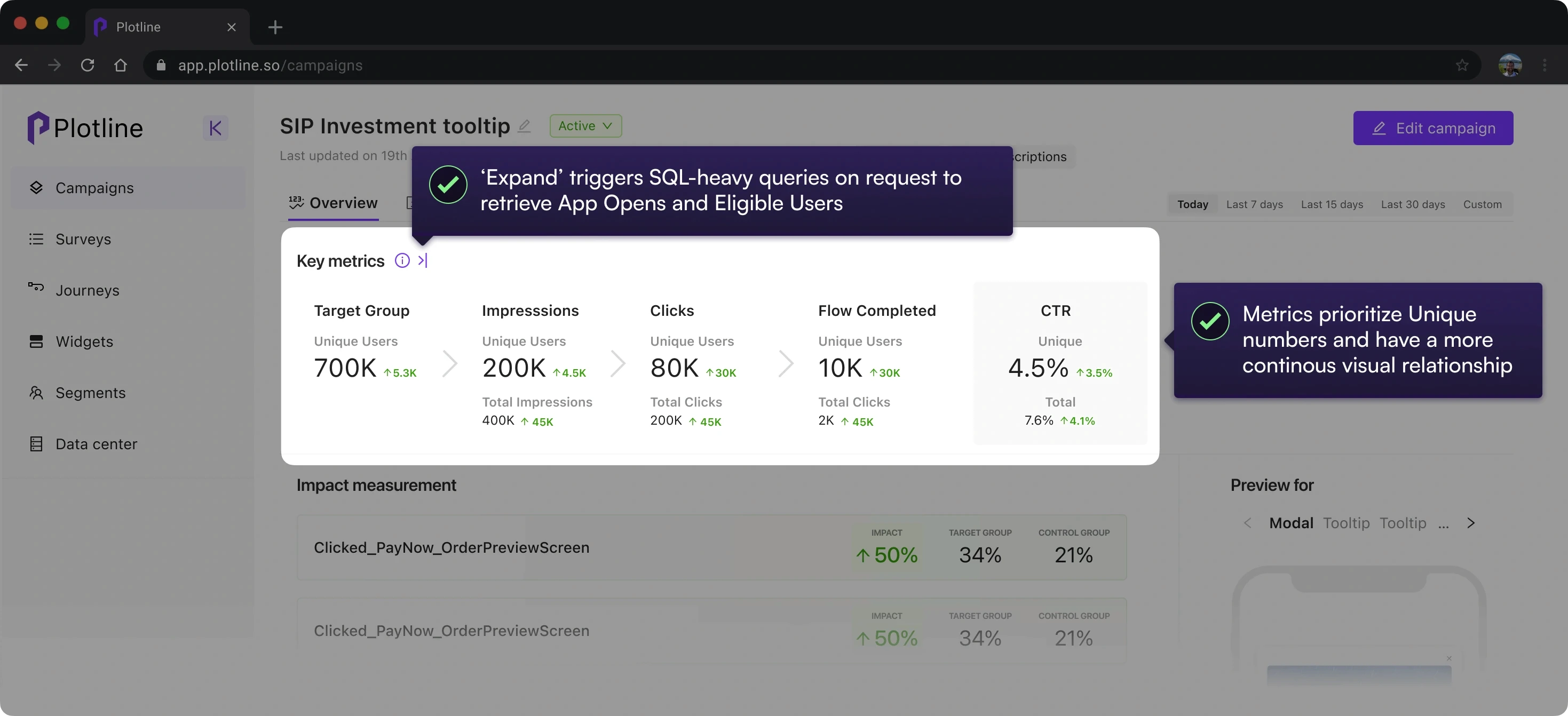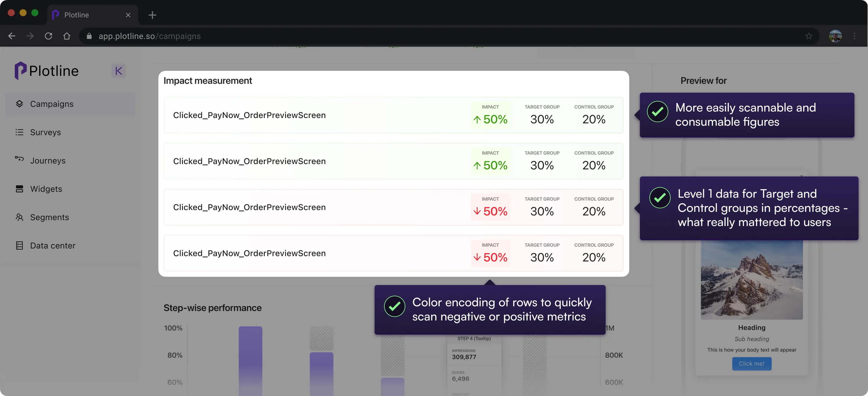 Campaign Preview was incorporated into the dashboard to prioritize recognition over recall. Users were now able to click through all steps and check them against conversion funnel.