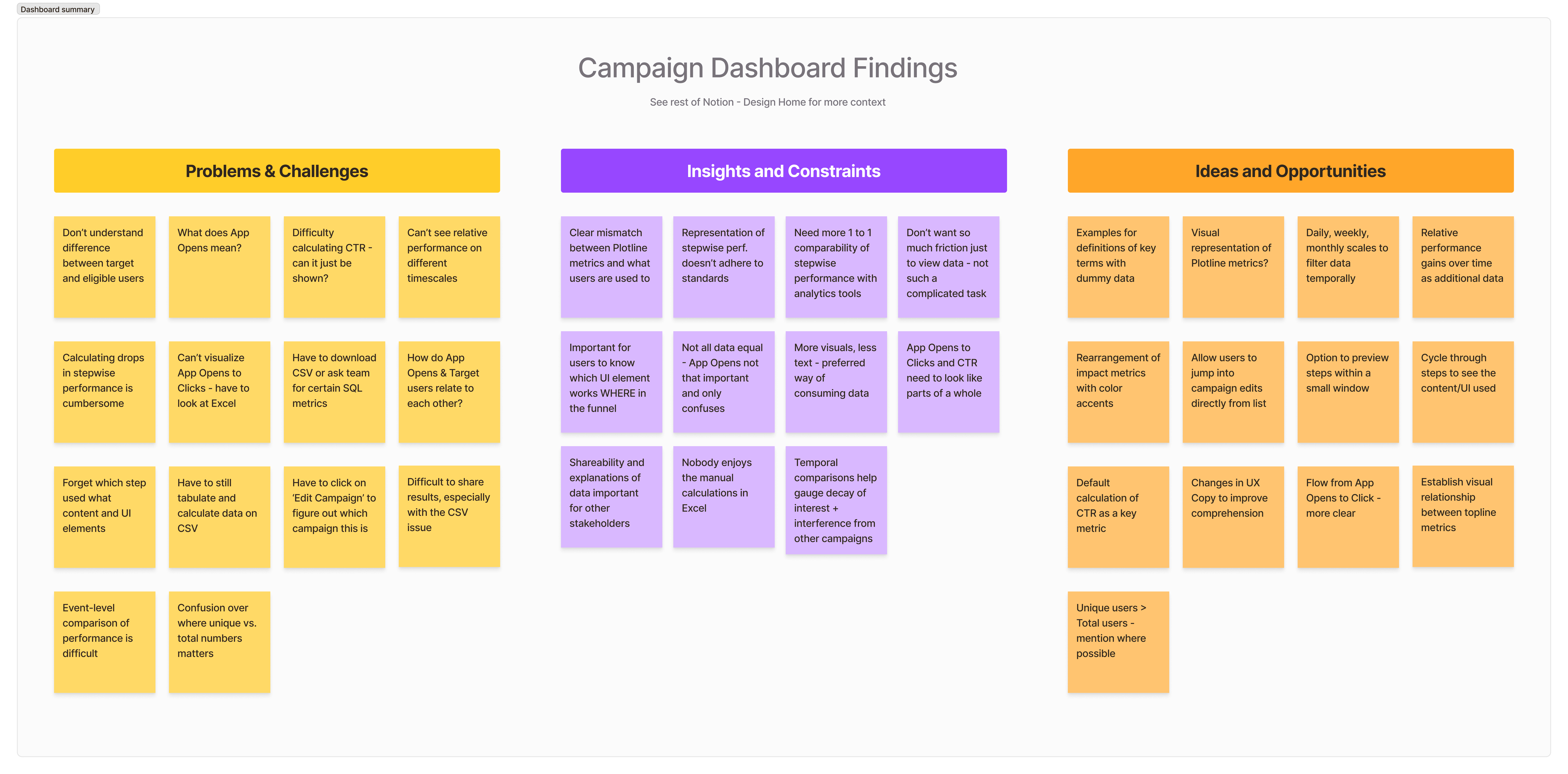 A collection of the insights we had gathered from scattered interviews for the Dashboard overhaul