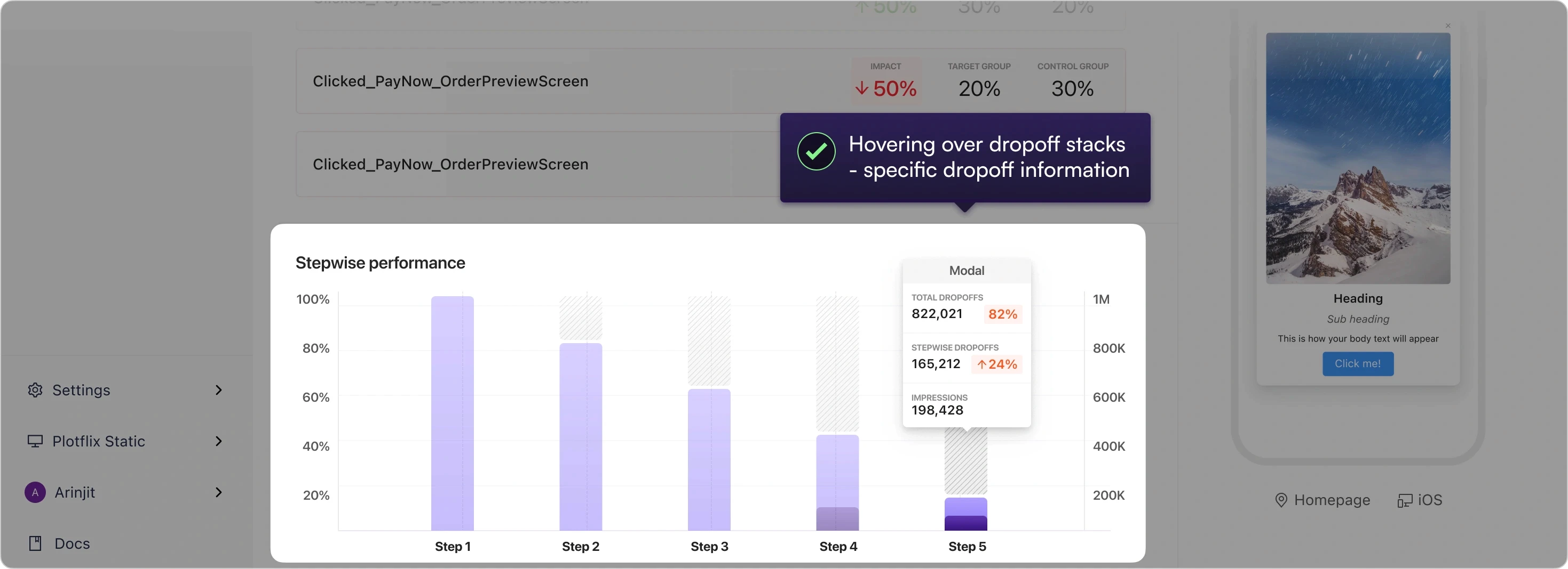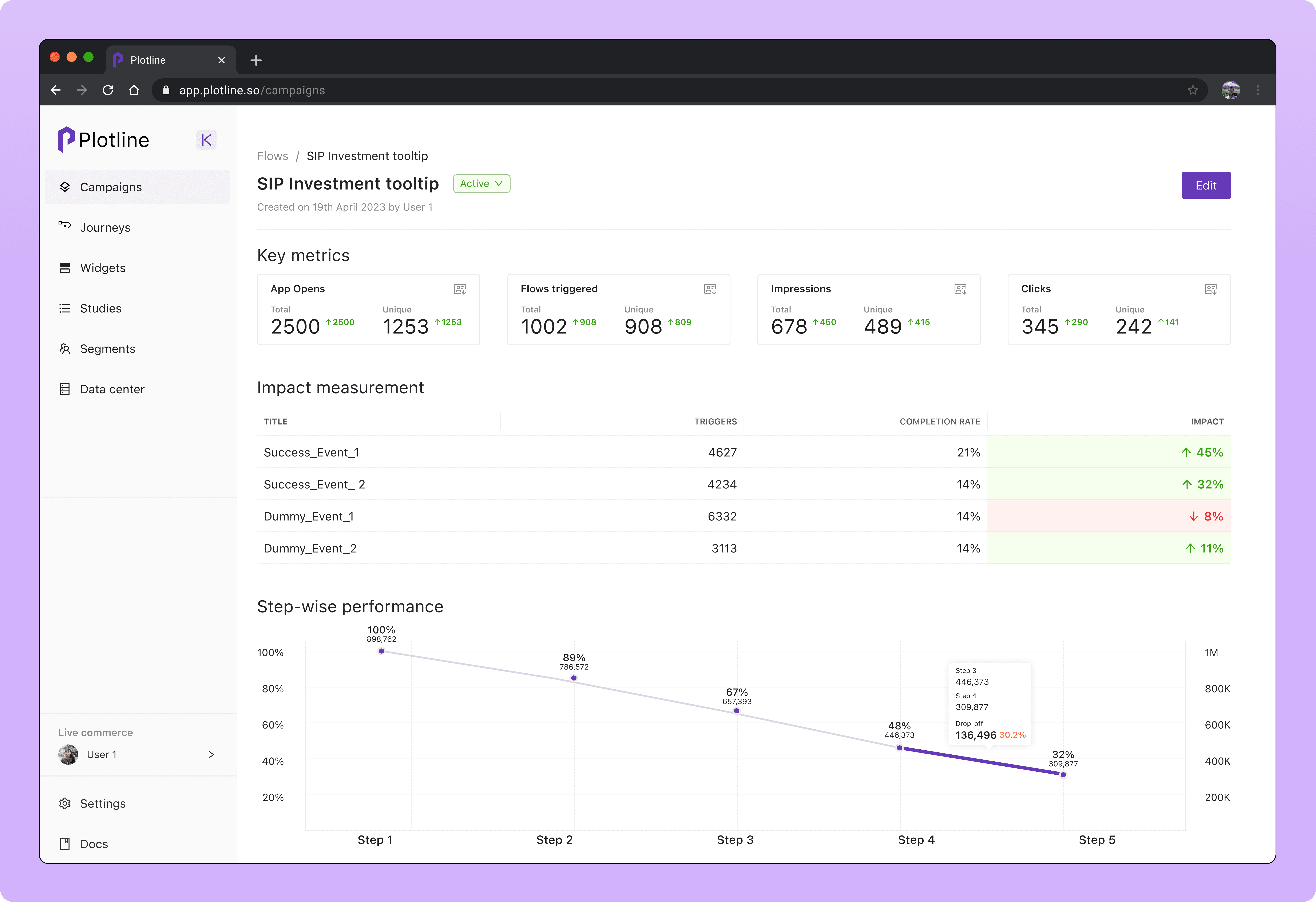 Stepwise drop-offs showed the percentages of conversions and drop-off in campaigns that utilized multiple UI nudges to guide users.