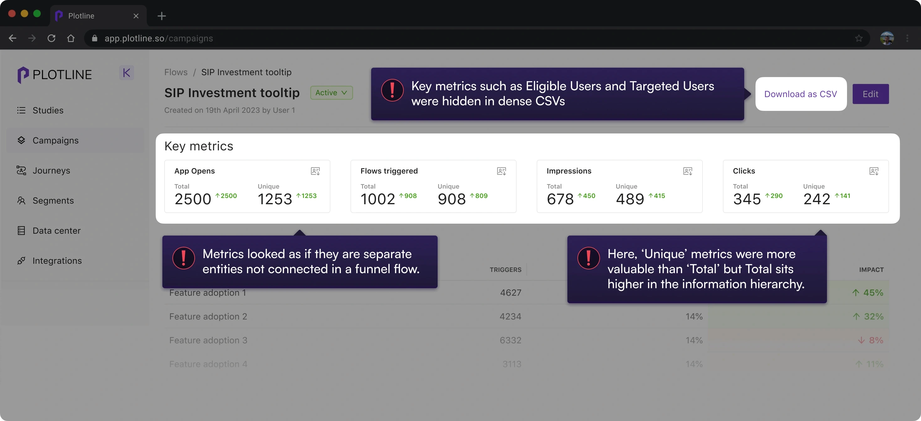 Users assumed their campaigns weren't peforming well despite performing well in reality, which led to dissatisfaction with Plotline. Essentially, we did a poor job of explaining and representing the metrics.