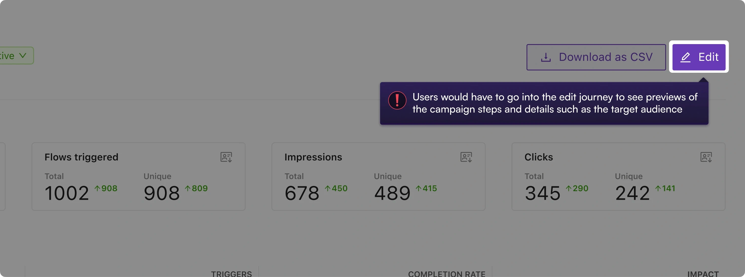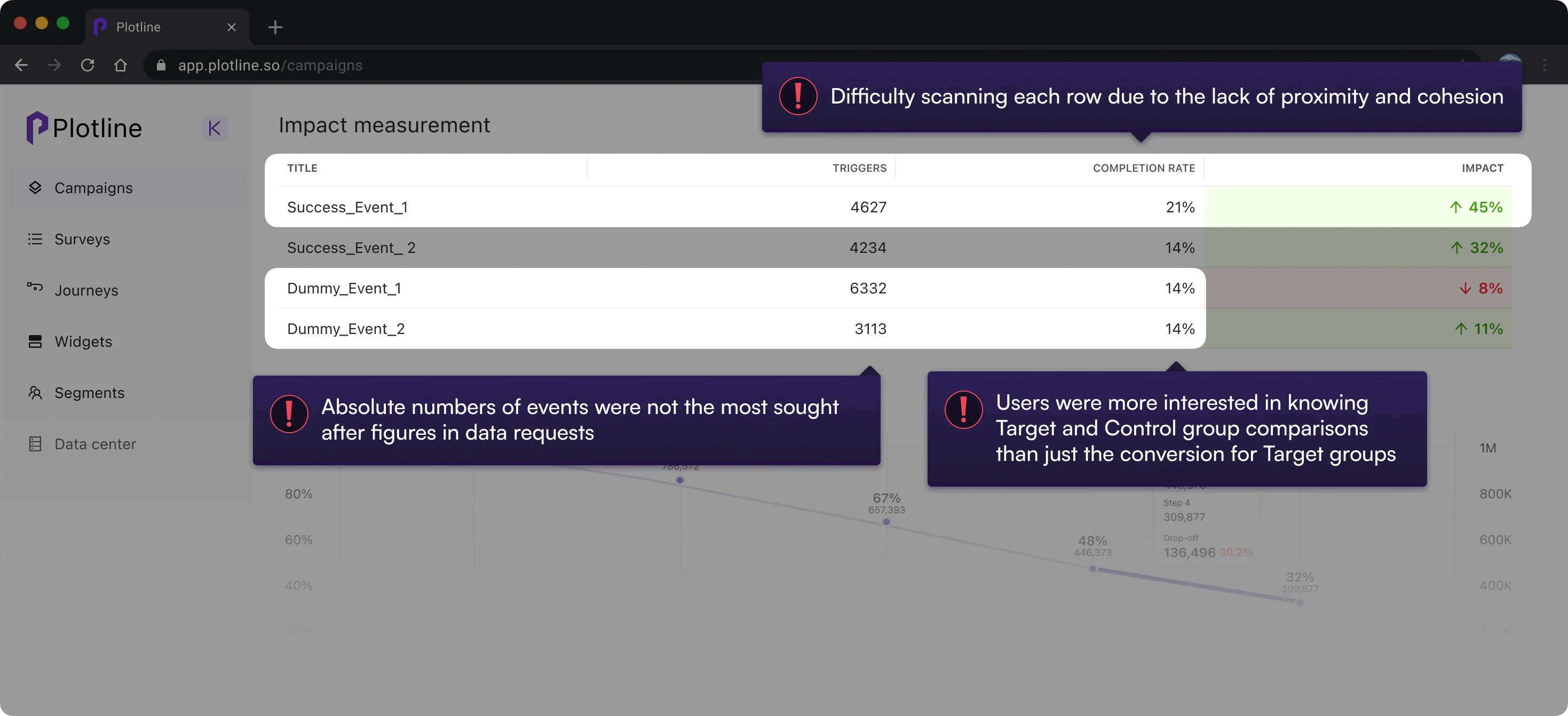 Impact metrics were hard to scan in one pass. Also, users were more interested in impact percentage in control vs. test than completion rates or journeys triggered.
